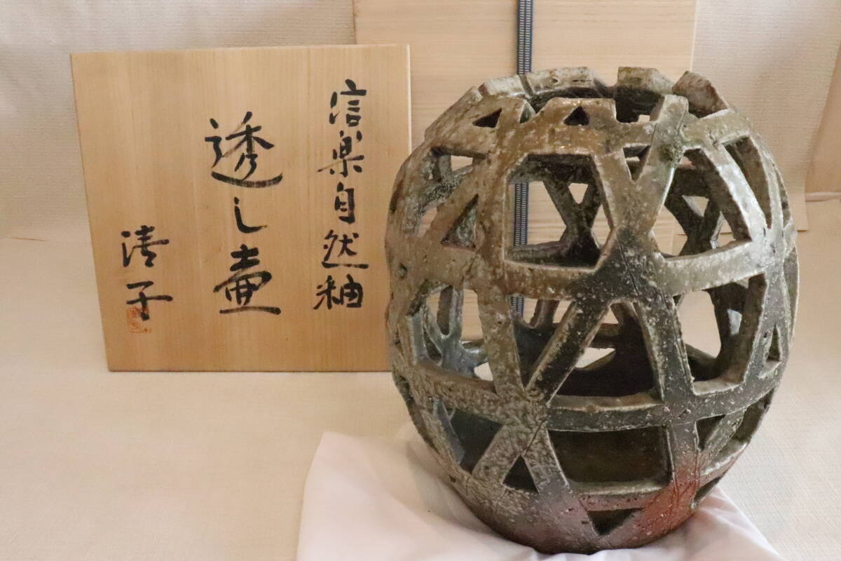 > 【hiro】NHKスカーレットの大人気女流作家! 神山 清子 造 最貴の逸品!信楽自然釉透し壷 共箱 ★検索★ 花入 ビードロ 盃 徳利 茶碗