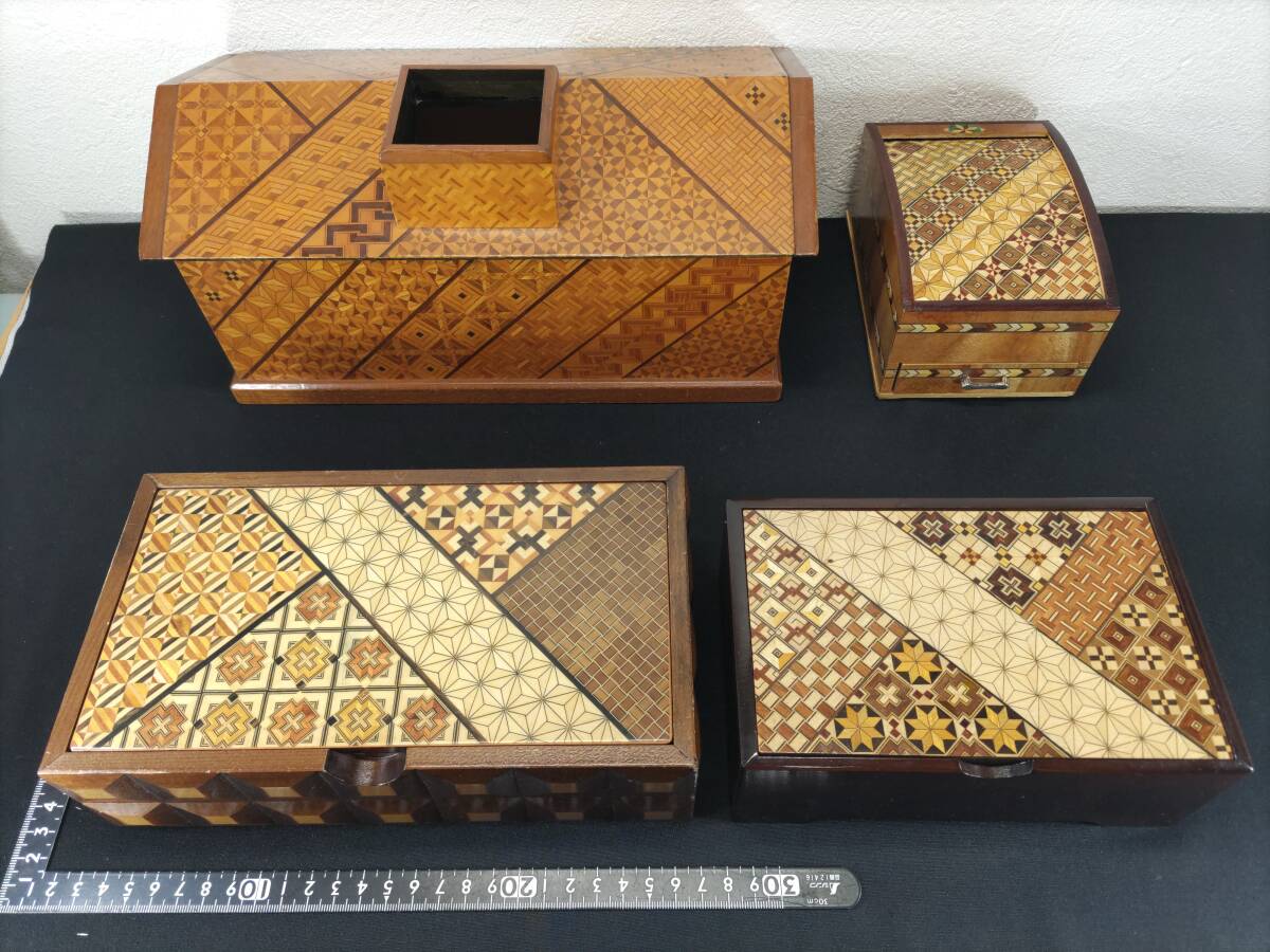 - ■送料無料!■まとめて■寄木細工■ティッシュケース■小引き出し■ミラー付き小物入れ■アクセサリーケース■4点セット!