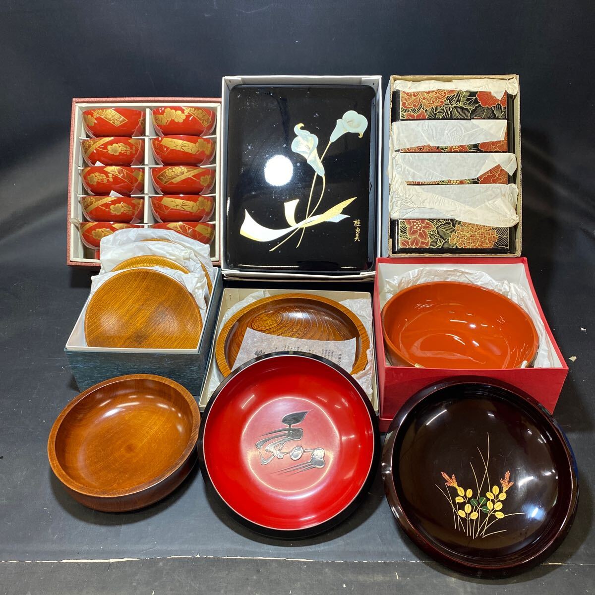 - N 6199 [ 木製 漆器 合成漆器 色々まとめて!!] 桂由美 木曽漆器 汁椀 漆塗り 箱入り 菓子鉢 鉢 器 お重箱 小皿 新品 中古 保管品