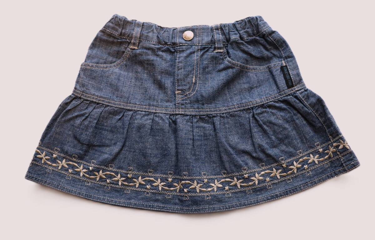 > 美品 組曲 デニムギャザースカート 可愛い 裾ベージュゴールド刺繍 80㎝ 90㎝ (株)オンワード樫山