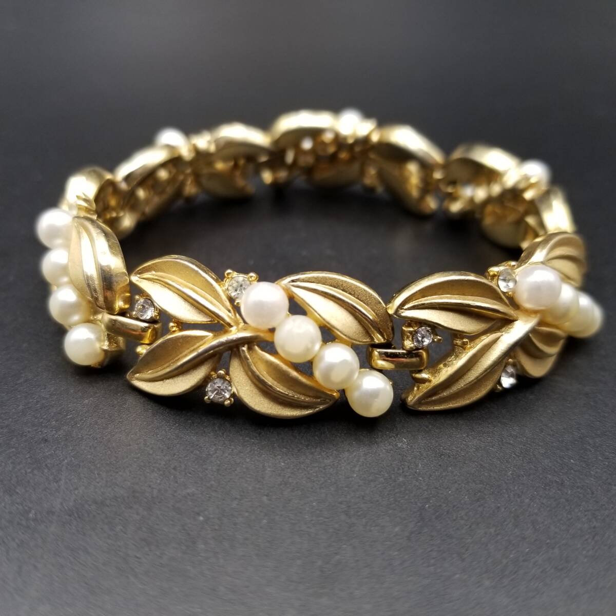 - 50'60's Crown Trifari パール装飾 フローラル ヴィンテージ リーフ ブレスレット ゴールトーン ゴージャス エレガント レトロ R16-B