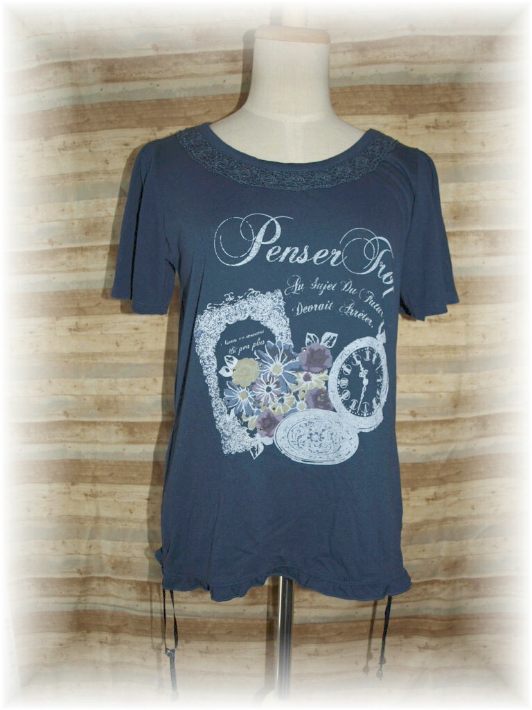 > axes femme お花のレース飾り 半袖POカットソー Tシャツ M ネイビー