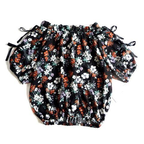 > 新品 レトロ 花柄 オフショルダー ブラウス 黒 M ボタニカル リボン クロップド丈 ショート丈 総柄 LUNACION ルナシオン
