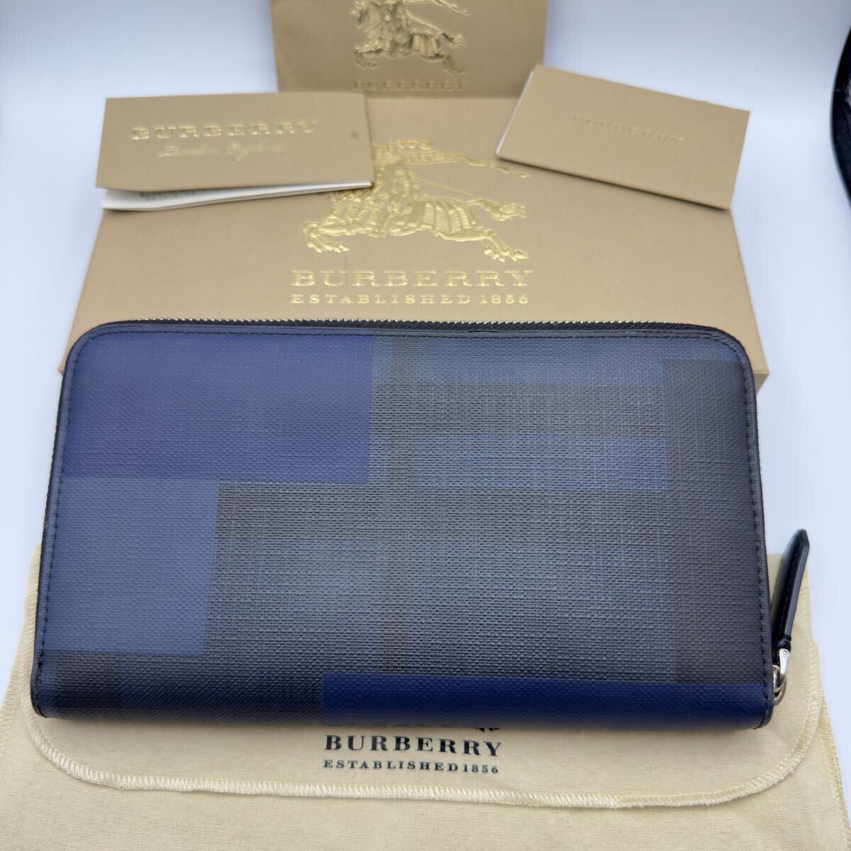 > 極美品 バーバリー ラウンドファスナー 長財布 ネイビー ブラック PVC レザー メンズ レディース 二つ折り財布 カードケース コインケース