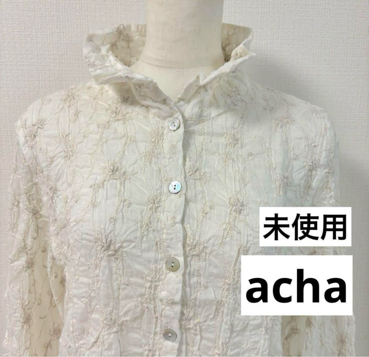 - 未使用◇acha◇アチャ◇花柄刺繍ブラウス◇ シワ加工◇スタンドカラー