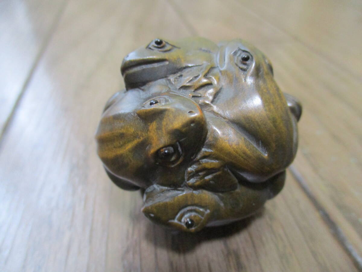 - カエル フロッグ 蝦蟇 カエルたくさん根付 木製 柘植 紫檀 石川の記銘あり レターパックプラス