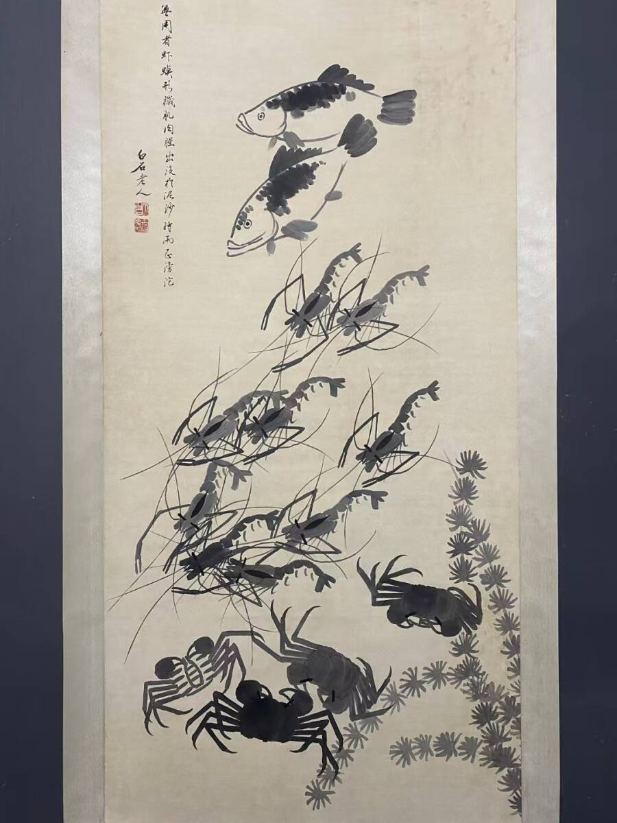 - 旧藏 四尺中堂画・群海老図・水龍吟 中国古画 純手描き画 水墨画 古美術品 時代物 中国古玩 骨董品 唐物 宣紙 7.10