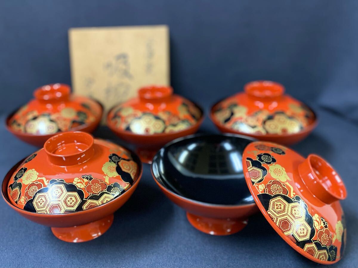 - 会津塗 吸椀 5客揃い 沙泥 漆器 漆芸 お椀 吸物椀 和食器 蓋物 蓋付き汁椀 木箱