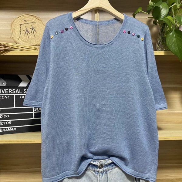 - 25zy サマーニット レディース トップス 高質 ラフ 麻タッチニット チュニック ナチュラル 麻混 サラサラ 涼感 Tシャツ 飾りボタン5
