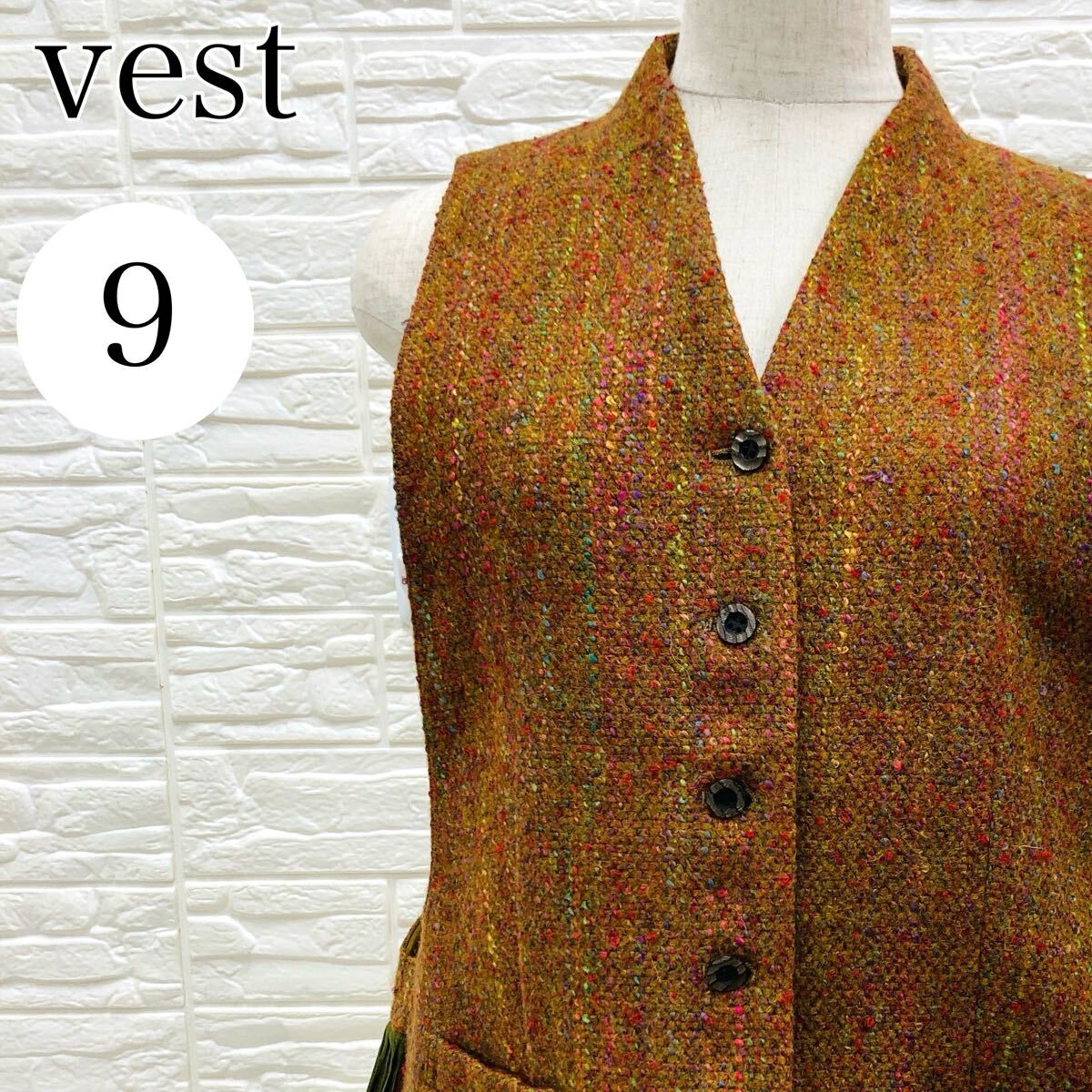> 【AA3921】 ベスト 9号 トップス ノーカラー ブラウン(茶) フリンジ オープンフロント ツイード カジュアル ポケット付き ジレ レディース