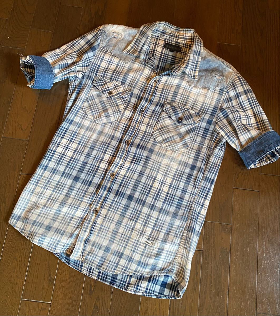 - バイカーライダーお兄系y2kグランジチェックデニムダンガリーシャツウエスタンワークvintagewashダメージ加工五分袖半袖ブルー系 トップス