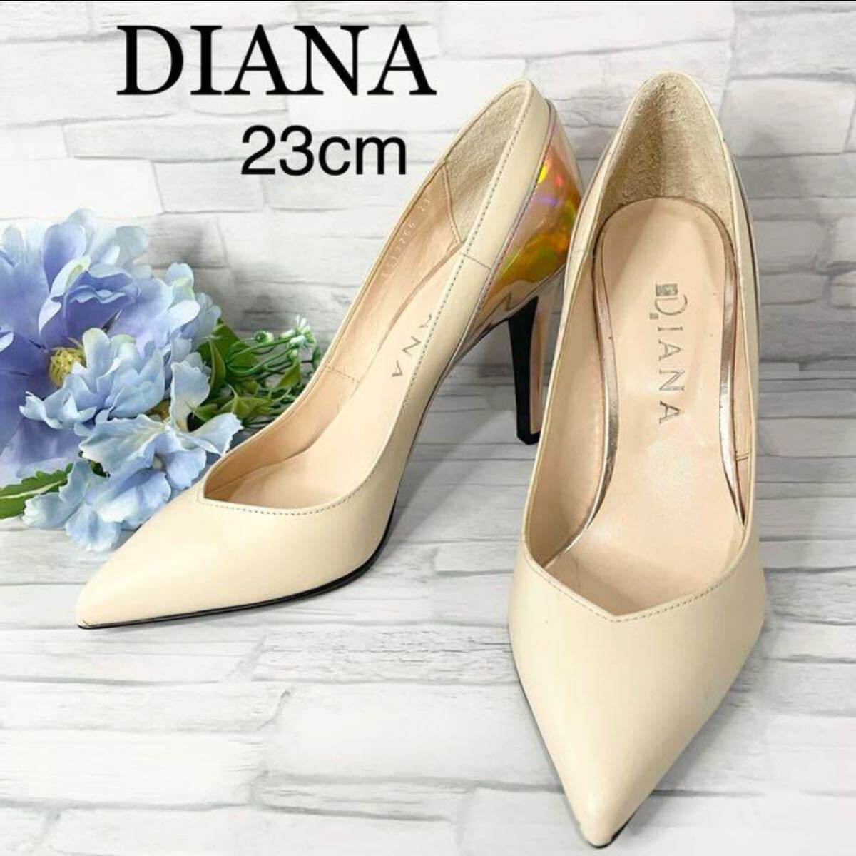 - 美品レザーハイヒール パンプス ベージュ DIANA ダイアナホログラムルブタンビジューラメホログラム