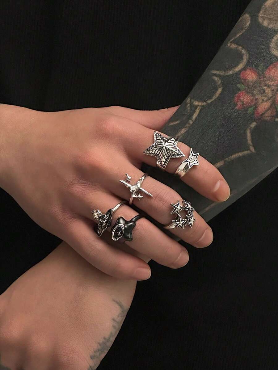 - リング メンズ セット パンクスタイル ラインストーン スター リング 6個セット、メンズカジュアルファッションジュエリー