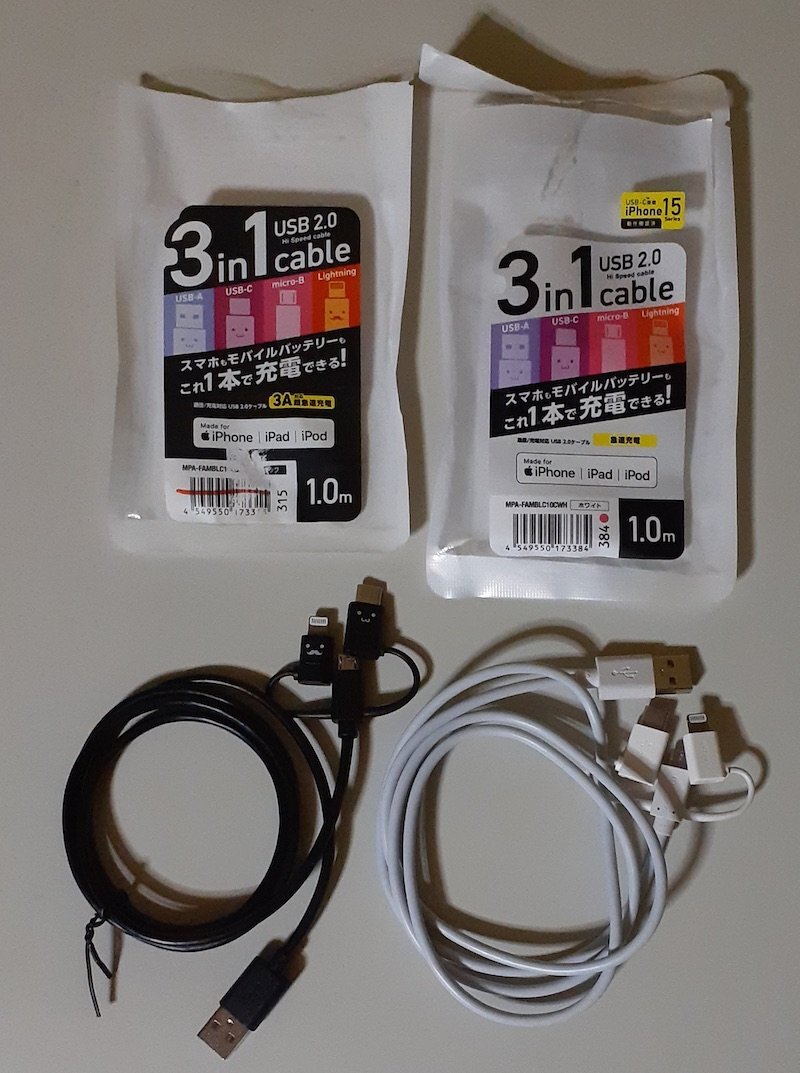 - 6180 MPA-FAMBLC10CBK MPA-FAMBLC10CWH 2色まとめて ELECOM 3in1 USB-A - MicroUSB/USB-C/Lightning 1.0m iPhone15動作確認済