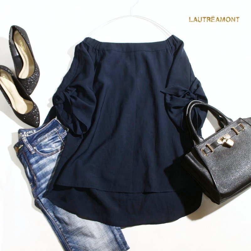 - 美品 ロートレアモン LAUTREAMONT 夏 ポリエステル 半袖 ブラウス カットソー 9号 38 ネイビー 紺 シンプル ミセス オフィス通勤 シンプル