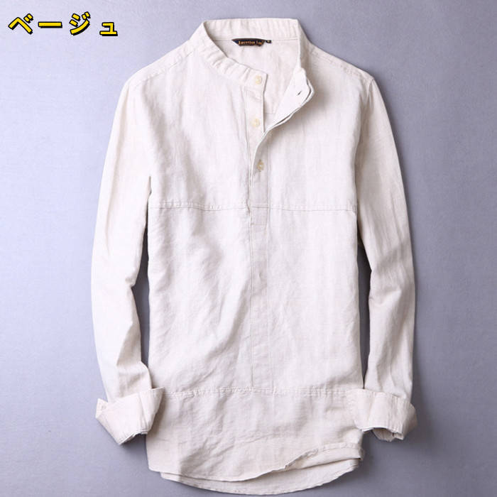 - 長袖シャツ リネンシャツ メンズ 立ち襟 スタンドカラー ヘンリーネック スリム カジュアルシャツ 綿麻 Zty-3385 ベージュ L