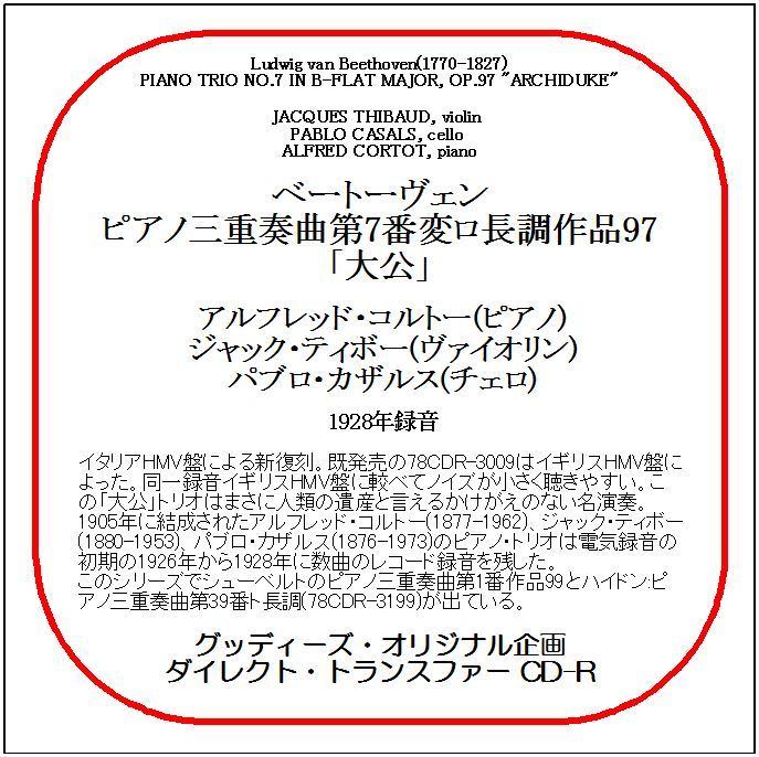 - ベートーヴェン:ピアノ三重奏曲第7番「大公」/コルトー/ティボー/カザルス/送料無料/ダイレクト・トランスファー CD-R