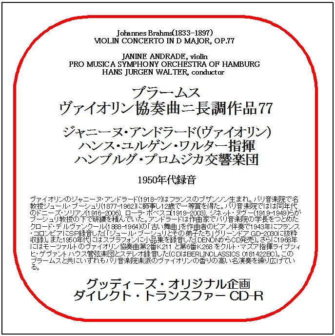 - ブラームス:ヴァイオリン協奏曲/ジャニーヌ・アンドラード/送料無料/ダイレクト・トランスファー CD-R