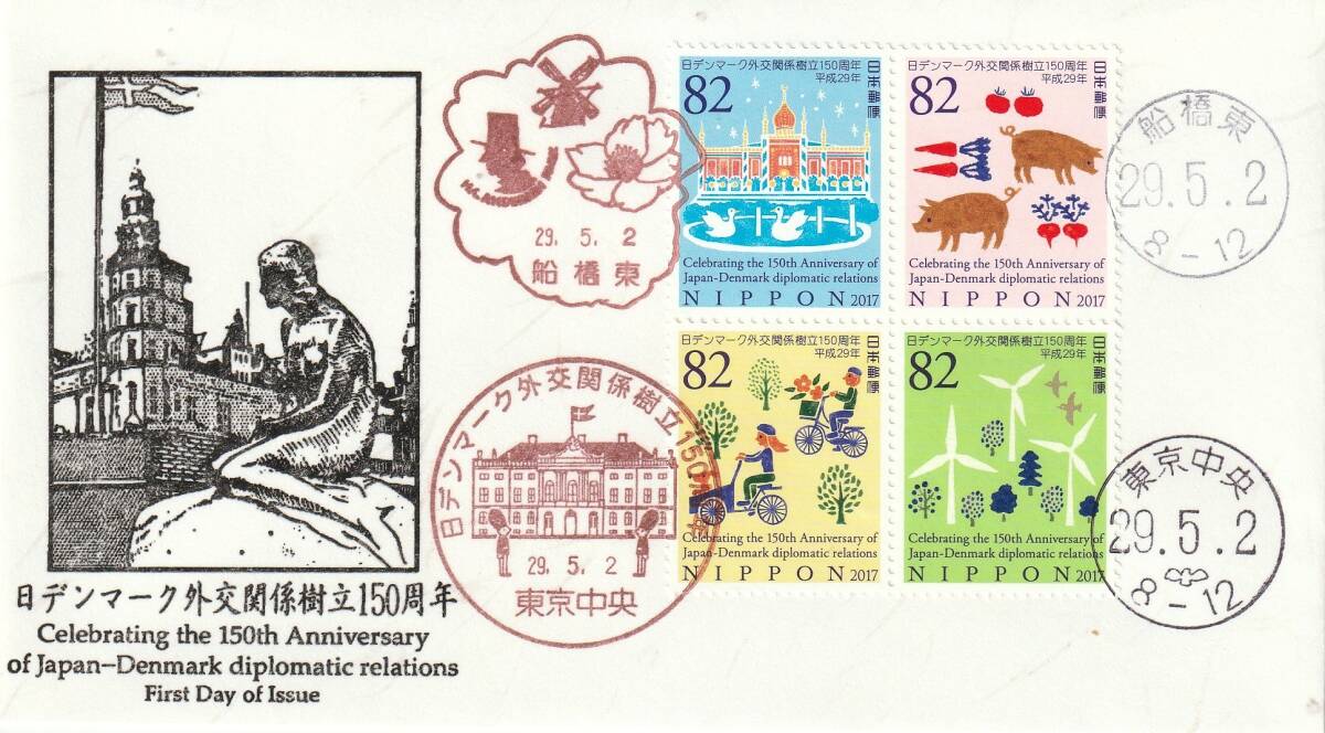 - FDC 2017年 日デンマーク外交関係樹立150周年 82円4貼4消し 鳴海
