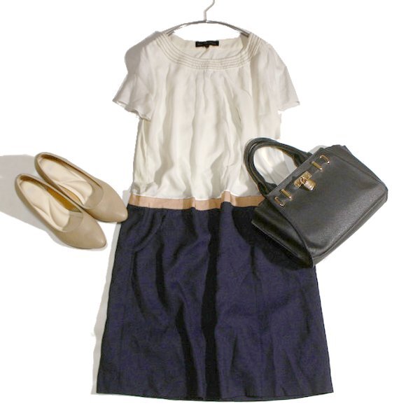 > 美品 ユナイテッドアローズ GREEN LABEL RELAXING異素材切り替え スーツ生地 ワンピース 40号 L 春 夏 25C07