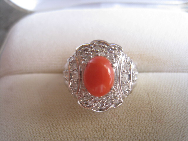 - [SAMU]極品! 天然赤珊瑚&天然ダイヤモンド0.60ct Pt900指輪 重さ8.9g★新品同様!