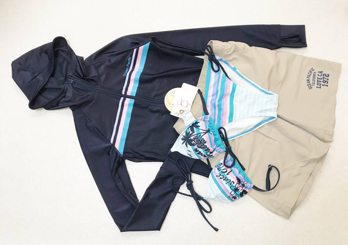 > 9M:オーシャンパシフィック【OP】三角ビキニ+UVカットUPF50+/ラッシュガード水着パーカー/セットボードショーツ:4点水着 定価:12,000+税