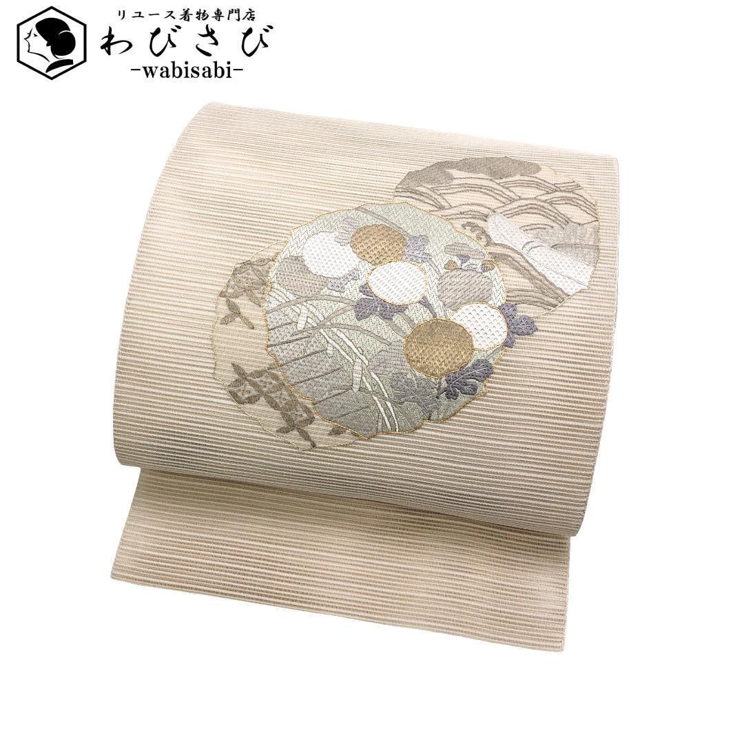 > 夏帯 名古屋帯 絽刺し 花模様 船 波模様 生成色 金糸 O-5149 着物 きもの kimono 和服 和装 中古 リサイクル着物 【送料無料】