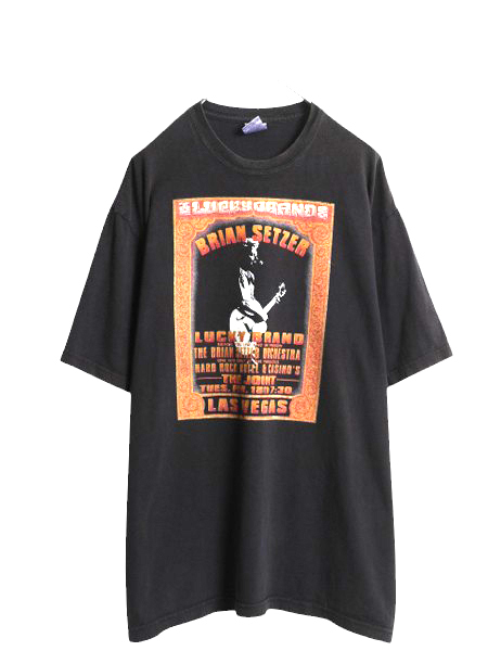 > 00s USA製 ラッキーブランド ブライアン セッツァー プリント Tシャツ メンズ L 古着 オールド イラスト ヘビーウェイト バンド ロック 黒