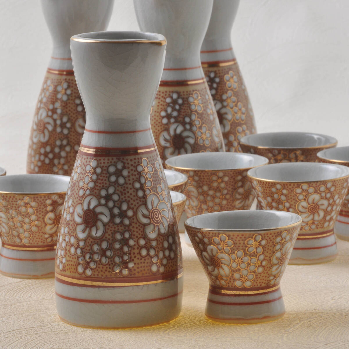 - 九谷焼 酒器揃 総梅十客 古陶器 花柄 金彩 赤粒 時代物 ヴィンテージ 蔵出し おもてなし