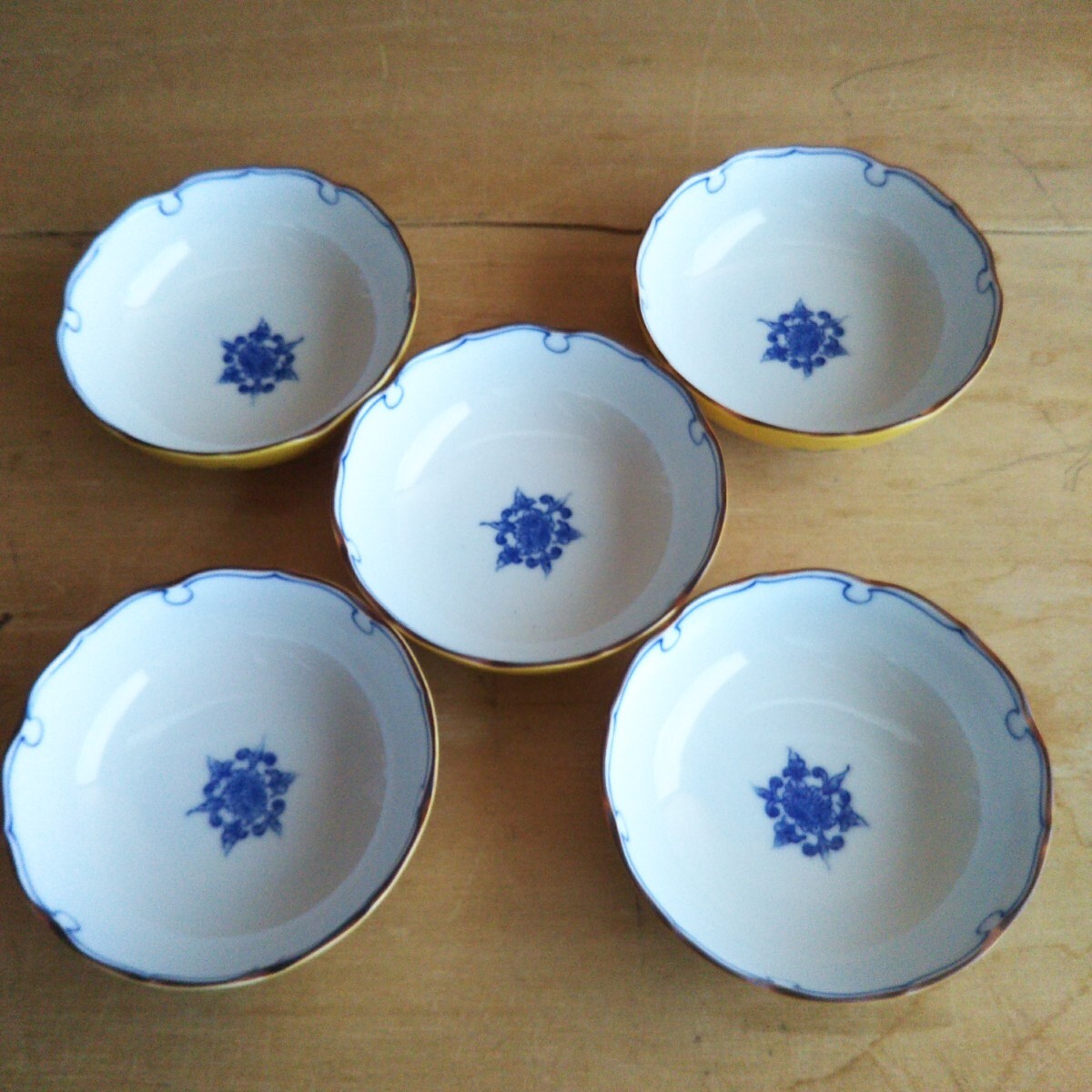 - 25072201 たち吉 中鉢揃 5枚セット 染付 橘吉 黄彩花紋 和食器 薄黄色 小鉢セット5客 コレクション