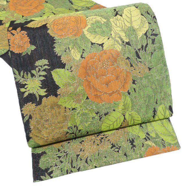 - 袋帯 未使用 正絹 フォーマル 仕立て上がり 六通 花模様 箔糸 黒色 緑系色 多色 金 きもの北條 A1242-12