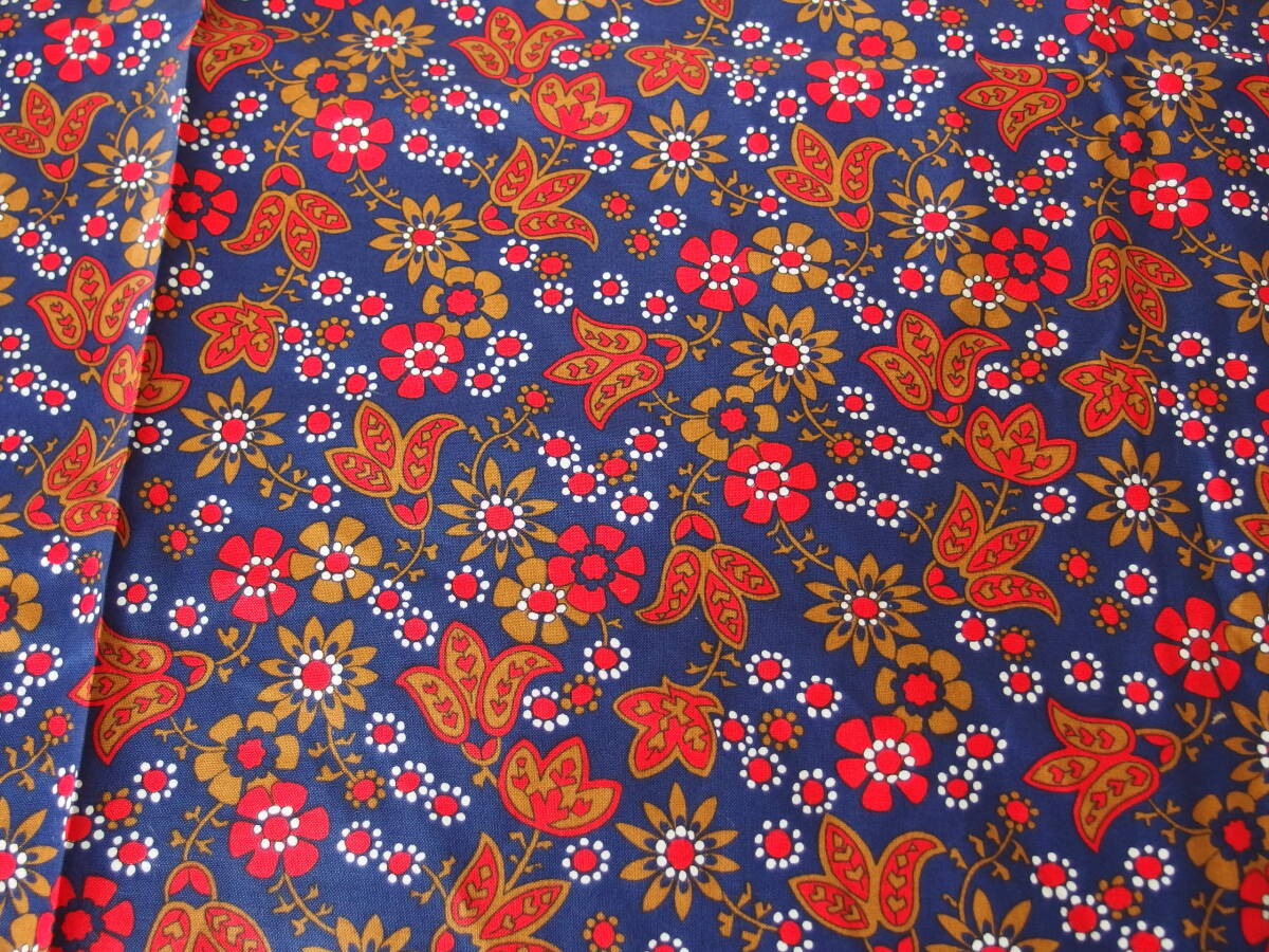 > SALE! 新品!スイス製 ヴィンテージ&レトロ ファブリック ハギレ 布地 生地 (紺色に赤い花柄 大人かわいいレトロな花柄プリント)118x130cm