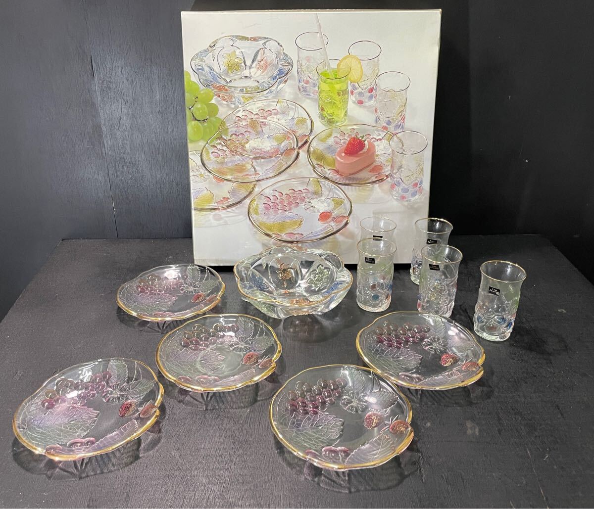 - 昭和レトロ ガラス 食器 セット グラス 皿 ボウル 箱入り イチゴ ぶどう フルーツ柄 デザート皿 フルーツ皿 金彩 インテリア コレクション