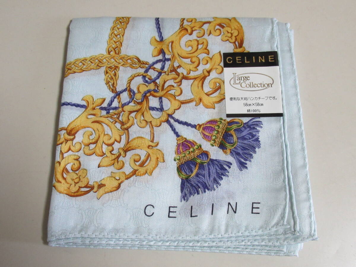 - R7 07★CELINE セリーヌ 大判ハンカチ 約58×58㎝ 綿100% 希少 マダカム総柄 タッセル 透かし織り込み 川辺