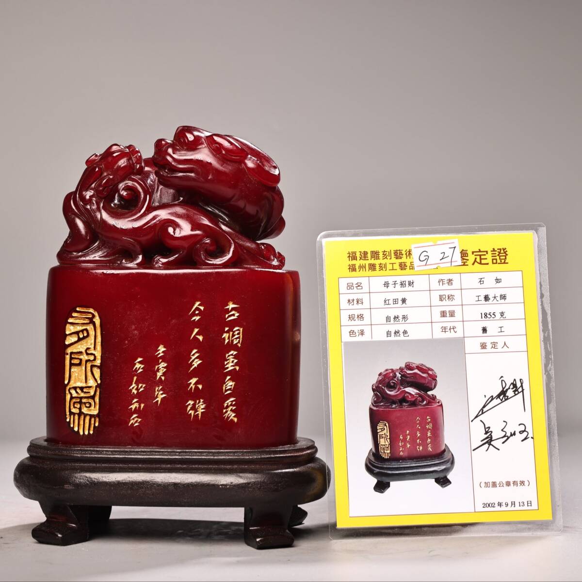 - 蔵友旧蔵出 寿山石 紅田黄石 細密彫 母子招財印章 箱付 貴重品 稀少物品 置物 賞物 中国時代美術品
