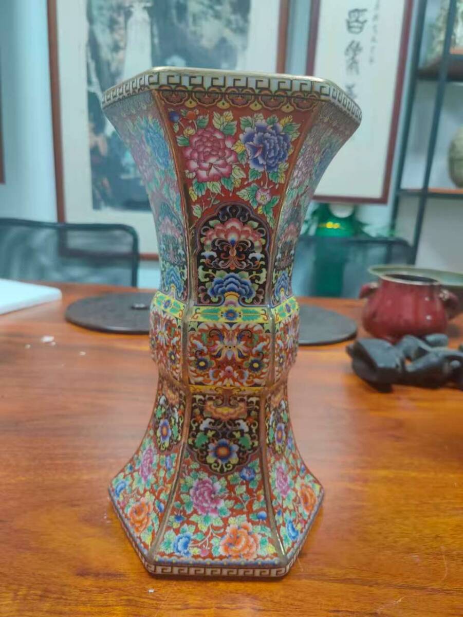> A059【3.1】中国骨董 人間国宝 磁器【雍正年制蒔金琺瑯彩花鳥六方賞瓶です】工芸品 施釉陶 青花磁 陶芸 精美彫 置物 收藏品