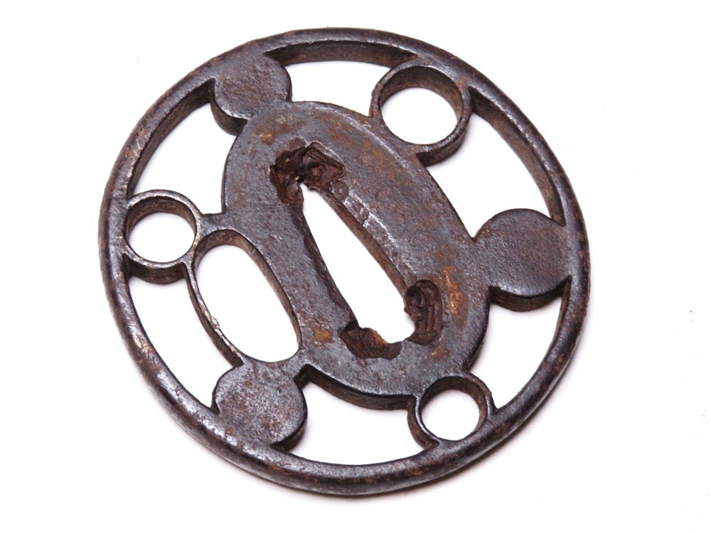 - 【10839】江戸〜明治時代 刀装具 鐵地 透かし 丸紋 鍔(初品・買取品)
