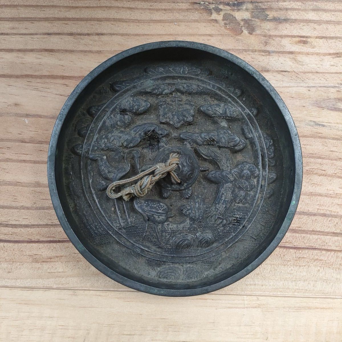 > 送料込み 徳川家関係の家の蔵出し品 三葉葵に似た紋様あり 天下一の銘あり 亀鈕松竹梅鶴文鏡 径12cm 重さ598g 蓬莱鏡古銅鏡 模様文様