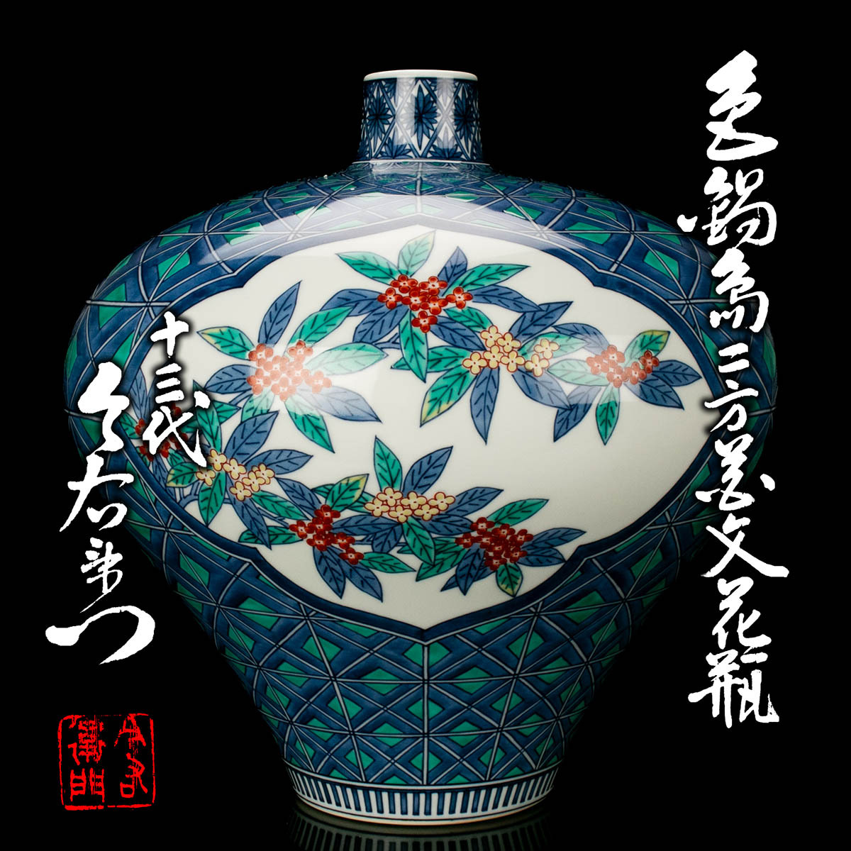 > 十三代今泉今右衛門『色鍋島二方花文花瓶』最上位希少作 共箱 共布 本物保証 送料無料 新品同様 大特価!【松森美術】