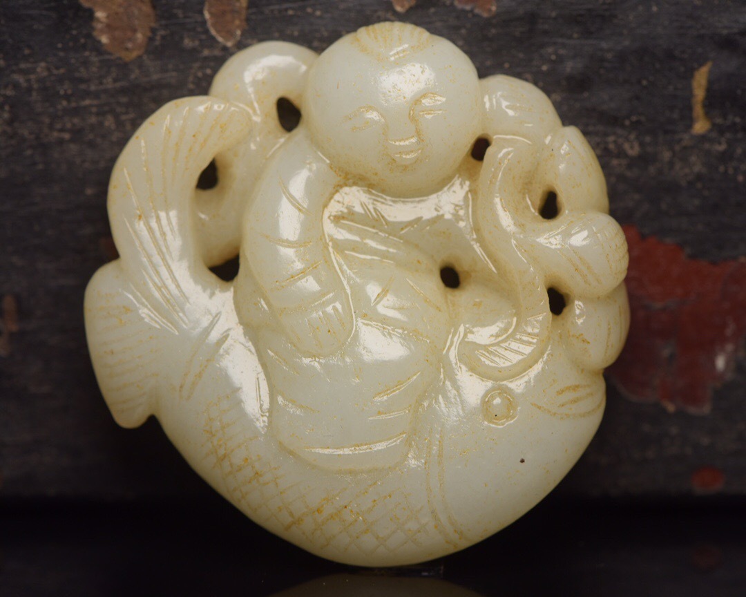 - 【超珍館蔵】和田玉製 細密彫 童子戲魚 置物 賞物 古賞物 古董品 古美術品 時代物 旧家蔵出 稀少珍蔵品