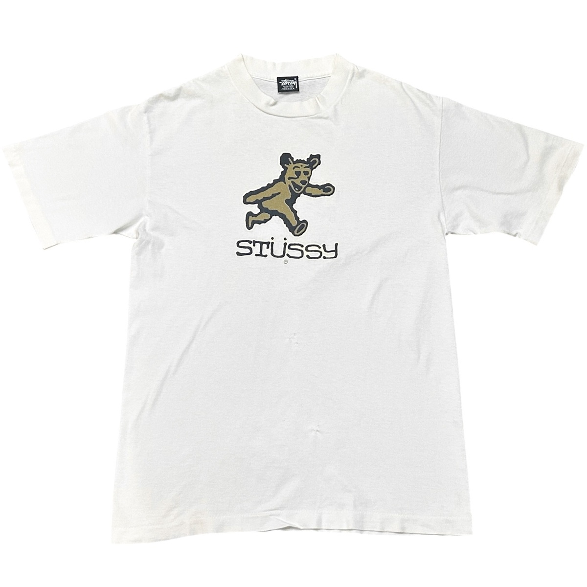 > ビンテージ レア 90’s OLD STUSSY オールドステューシー熊 ベア プリントTシャツ 黒タグ 白 1990年代USA製 size M 80’s ステューシー