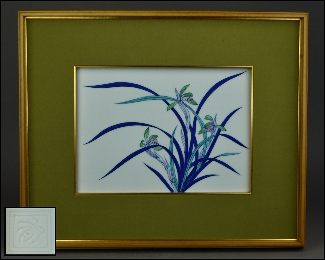 - 【ACT】有田焼【香蘭社】染付 色絵 蘭花 陶板画 額装 美術品 A7-722AE