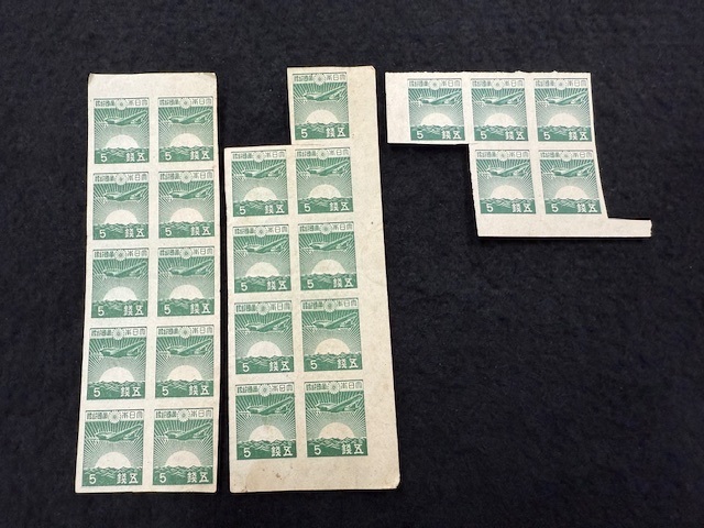 - 16、日本切手 1945年 第3次昭和切手 朝日と戦斗機 5銭 ブロック 24枚 未使用