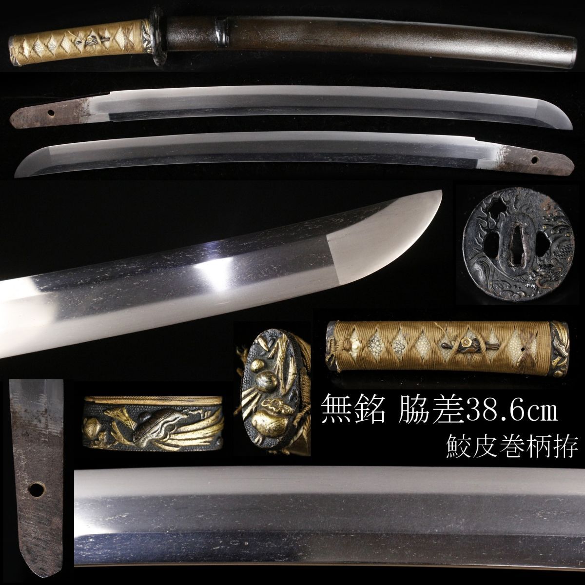 > 【LIG】無銘 脇差 38.6㎝ 直刃 鮫皮巻柄拵 鉄地金象嵌龍図鍔 赤銅宝尽図縁頭 刀剣武具 [.WR]25.7