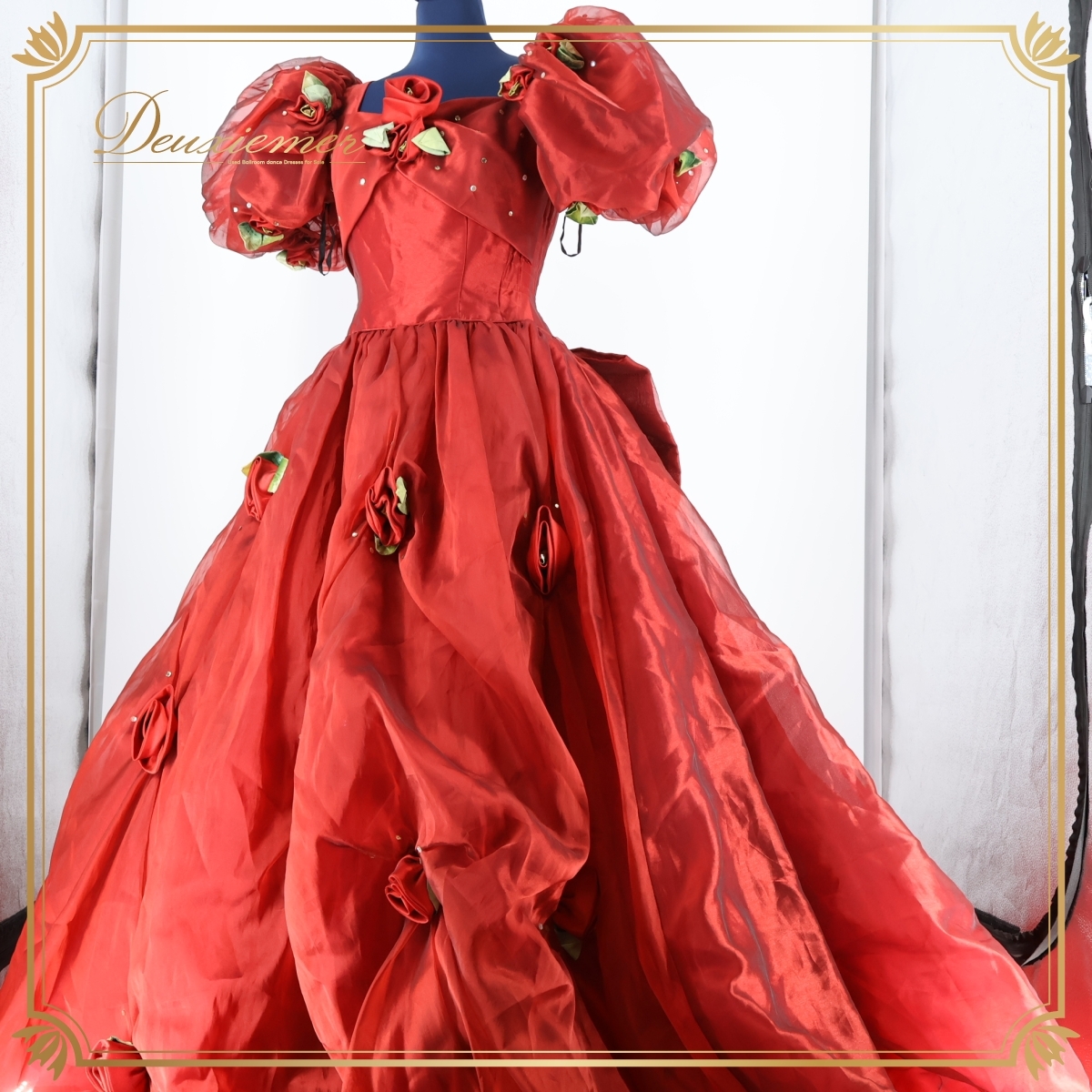 - パーティドレス 衣装 ドレス ワンピース 演奏会 ウエディング カラードレス レッド系 赤 薔薇 花 光沢 ボリューム 黒 ブラック系 ロング