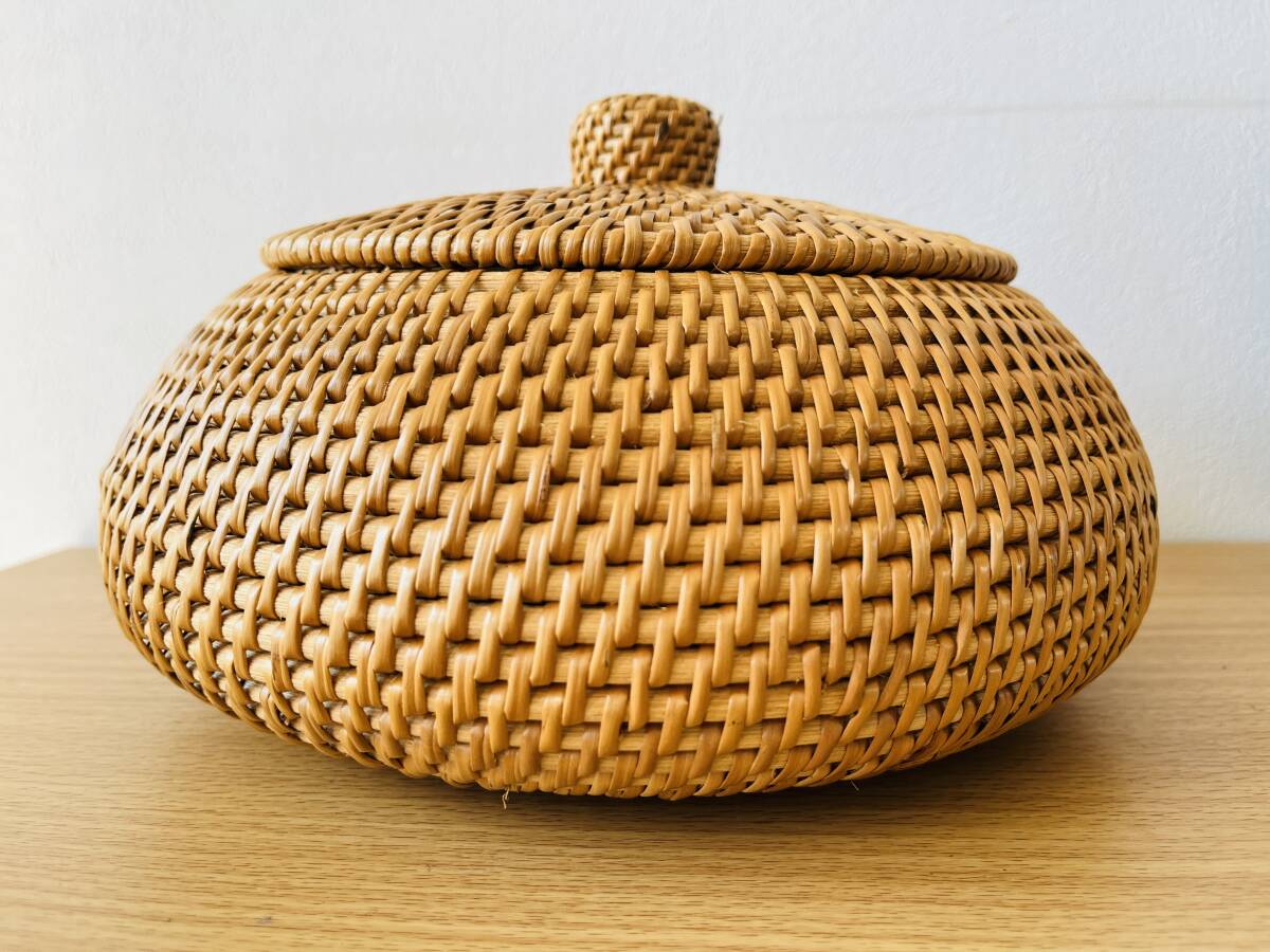 - アジア籐籠 円形蓋付き籐駕籠 ころんとお洒落な籠