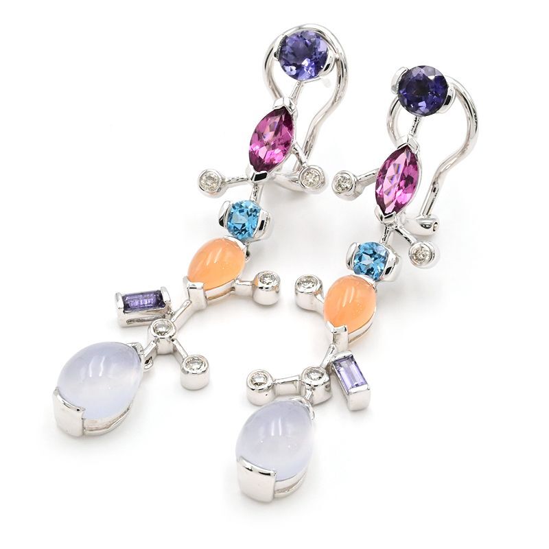 > 両耳合計8.06ct天然マルチストーンピアス K18WG 0.24ctダイヤ ロングピアス カボションカット ホワイトゴールド 地金10.3g 中古 送料無料
