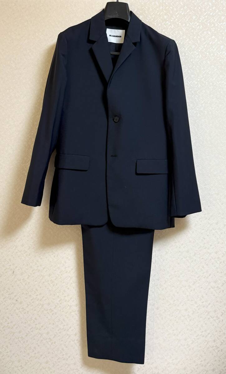 ジルサンダー(JIL SANDER)の春夏ウール・モヘア混スーツ、ネイビー サイズ46です。裏地なしの春夏もの、ウール・モヘア混でやや光沢があります。定番スーツで、ビジネスはもちろん、ジャケットとパンツ別々にカジュアル場面でもコーディネイトできます。素材はウール73%,モヘア27%。元supremeヘッドデザイナー、現OAMCのデザイナールークメイヤーによるデザインです。ルークのジルサンダーらしく他のトップブランドに比べても、もう一段上質な生地を使っています。日本での定価は23万円くらいだと思います。