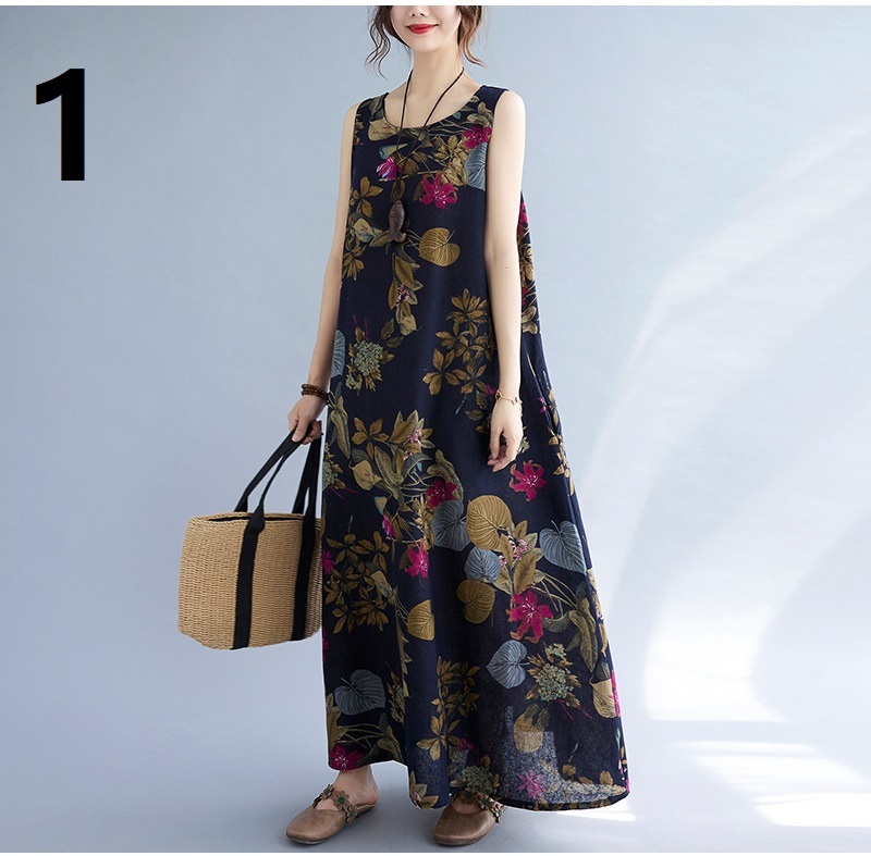 - 新入荷人気推薦ワンピース ロングワンピース マキシワンピース エスニックワンピース コットンリネン 綿麻 花柄 総柄 プリント M