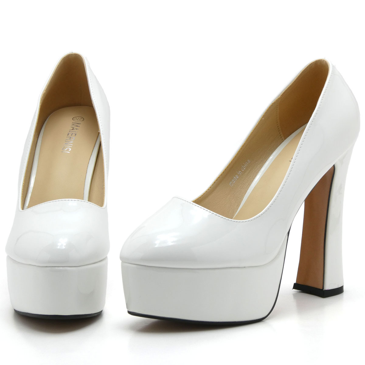 - 新品 大きいサイズ パンプス ホワイト 27cm 131420-44 エナメル調 前厚底ストーム ハイヒール 太ヒール